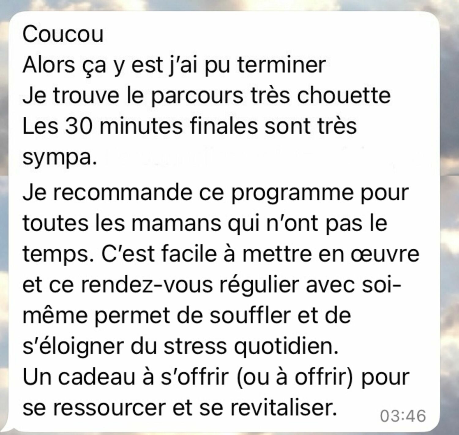 Mais tu n’as jamais osé prendre vraiment soin de toi, par peur de regretter des moments avec tes enfants, par peur de ne pas atteindre cet objectif au travail, par peur de ne pas être partout, tout le temps.